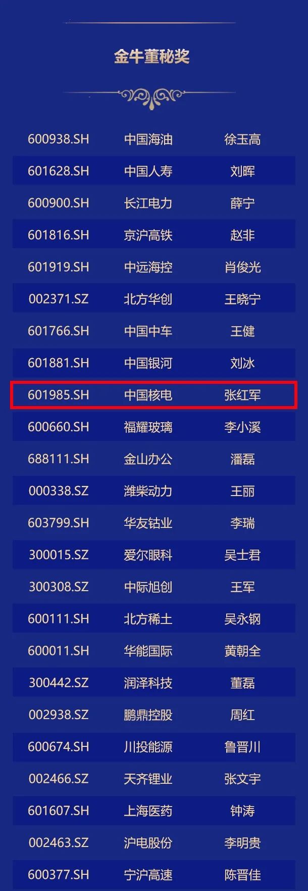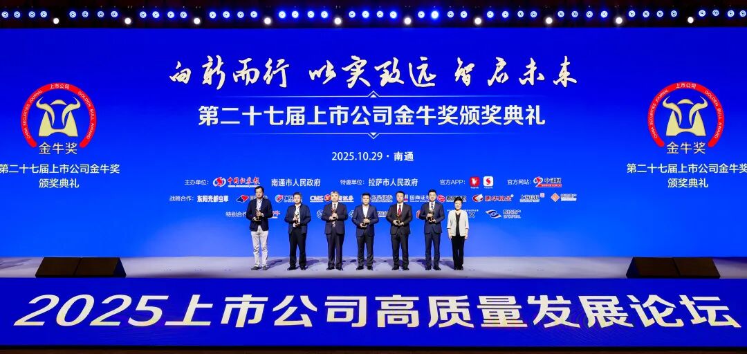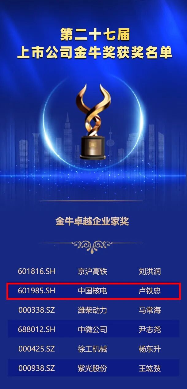 10月29日,由中国证券报与南通市人民政府主办的2025上市公司高质量发展论坛暨第二十七届上市公司金牛奖颁奖典礼在南通举行。中国核电(股票代码:601985)喜获双荣:公司董事长、党委书记荣获“金牛卓越企业家奖”,公司党委委员、董事会秘书荣获“金牛董秘奖”。