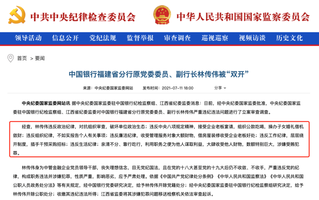 7月11日,中央纪委国家监委网站消息称,日前,经中央纪委国家监委批准,中央纪委国家监委驻中国银行纪检监察组、江西省纪委监委对中国银行福建省分行原党委委员、副行长林传伟严重违纪违法问题进行了立案审查调查。