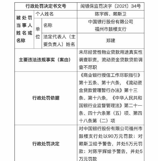 另根据闽银保监罚决字〔2021〕34号行政处罚决定书,中国银行股份有限公司福州市鼓楼支行因未尽经营性物业贷款用途真实性调查职责,流动资金贷款贷前调查不尽职,中国银保监会福建监管局对该支行处以90万元罚款;并对两位相关人员给予警告,并分别处5万元罚款。