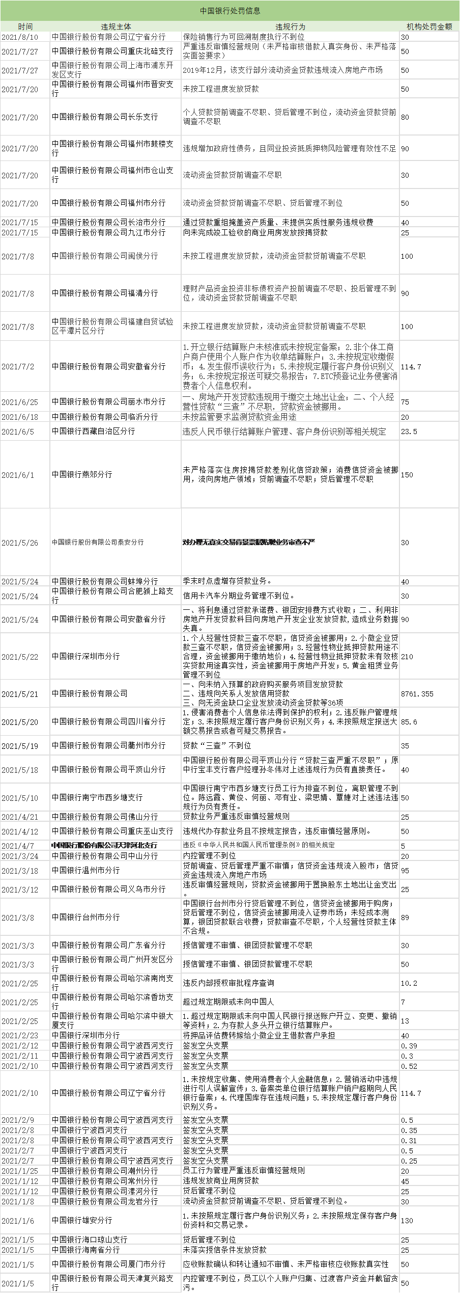 凤凰网财经《银行财眼》5月21日曾报道,银保监会对华夏银行、渤海银行、中国银行、招商银行、东亚银行(中国)有限公司等5家金融机构及相关责任人员依法作出行政处罚决定,处罚金额合计约3.66亿元。其中,针对中国银行违规发放并购贷款、违规向部分已签约代发工资客户收取年费等36项违法违规行为,依法没收违法所得并处罚款合计8761.355万元,对1名责任人员予以警告处罚。