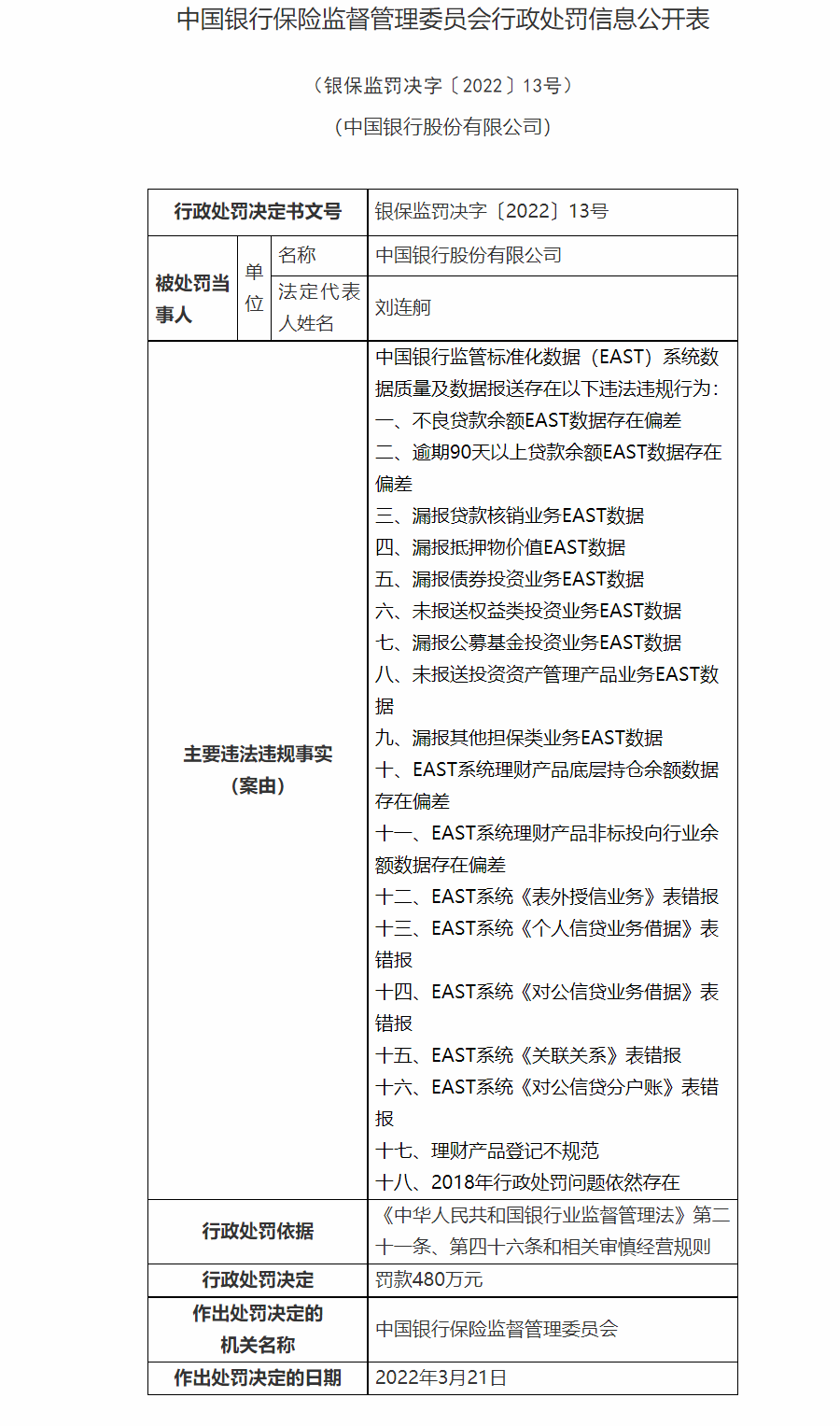 3月25日下午,银保监会就“监管标准化数据(EAST)系统数据质量及数据报送违法违规行为”开出21张罚单,中国银行因监管标准化数据(EAST)系统数据质量及数据报送18项违法违规行为被罚款480万元。