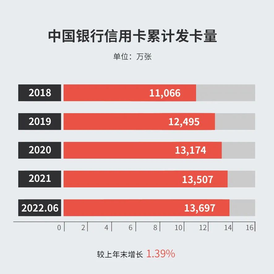 截止2022年6月末,中国银行信用卡累计发卡量13,696.79万张,较上年末增长1.39%;