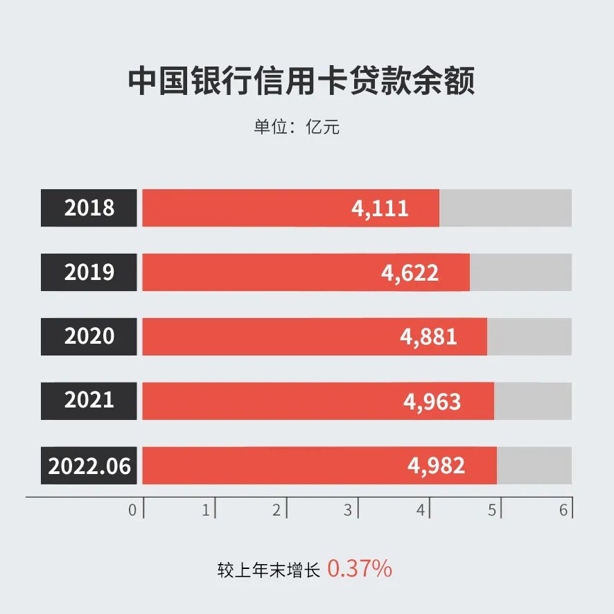 截止2022年6月末,中国银行信用卡贷款余额4981.52亿元,较上年末增长0.37%;