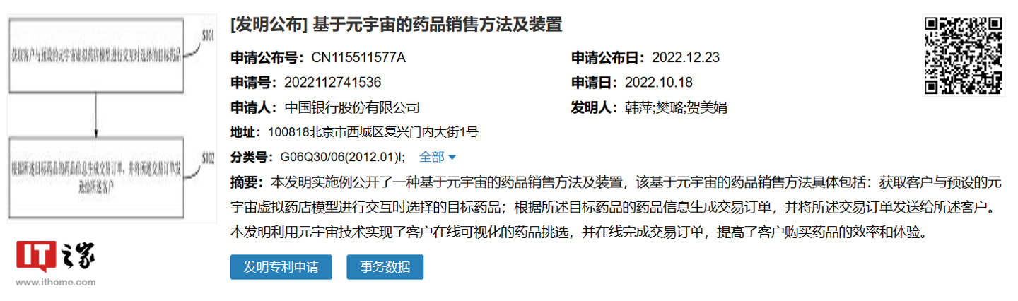 IT之家 12 月 23 日消息,据国家知识产权局中国专利公布公告(申请公布号:CN115511577A)显示中国银行股份有限公司申请的“基于元宇宙的药品销售方法及装置终端”专利获授权公布。