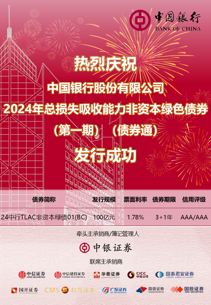 12月13日,中国银行在银行间市场成功簿记发行中国银行股份有限公司2024年总损失吸收能力非资本绿色债券(第一期)(债券通),规模100亿元,票面利率1.78%。