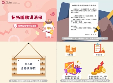 宁波市分行结合真实案例,通过我行员工的演绎,以通俗易懂的形式,制作原创短视频《理财“门当户对”》,生动地向公众普及金融知识,帮助消费者了解自身权利。青岛市分行结合真实案例制作系列风险提示长图文——《增强风险责任意识,树立理性投资观念》、《做理性投资者,从了解“三适当”开始》,并通过微信公众号发布,以简单清晰、通俗易懂的图文形式吸引消费者点阅学习,助力消费者正确认识金融产品和服务,了解自身合法权益,提高识别风险防范意识。深圳市分行以中国证监会发布的《私募投资基金监督管理办法(征求意见稿)》为蓝本,设计制作了理财投资教育视频《拓拓鹏鹏讲消保之合格投资者认证攻略》,通过生动有趣的动画形式,详细解释了合格投资者认证的过程和必要性。