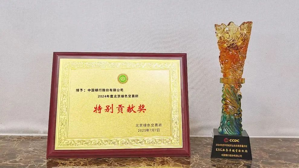 近日,中国银行分别获得北京绿色交易所“2024年度特别贡献奖”和中债成员业务发展质量评价“2024年度ESG业务卓越贡献机构”两项荣誉,进一步彰显了中国银行发挥金融市场业务特色优势,切实推动绿色低碳发展的新成效。