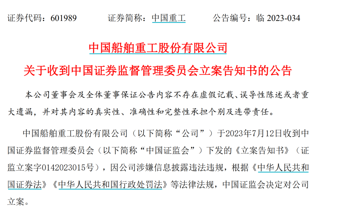7月12日晚间,中国船舶重工股份有限公司(中国重工,601989.SH)披露了公司收到中国证券监督管理委员会立案告知书的公告。对此,中国重工表示,立案期间,公司将积极配合中国证监会的调查工作,并严格按照规定履行信息披露义务。
