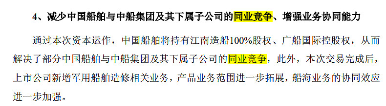 在中船集团内部整合之前,中国船舶上市公司是没有军工业务的。整合后,军工业务占比份额也并不高。