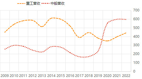 从营收看,重工的营收在19年以前一直比中船高,在19年中船纳入江南船厂、外高桥、广船后,中船一举超过重工,位居造船厂营收第一。