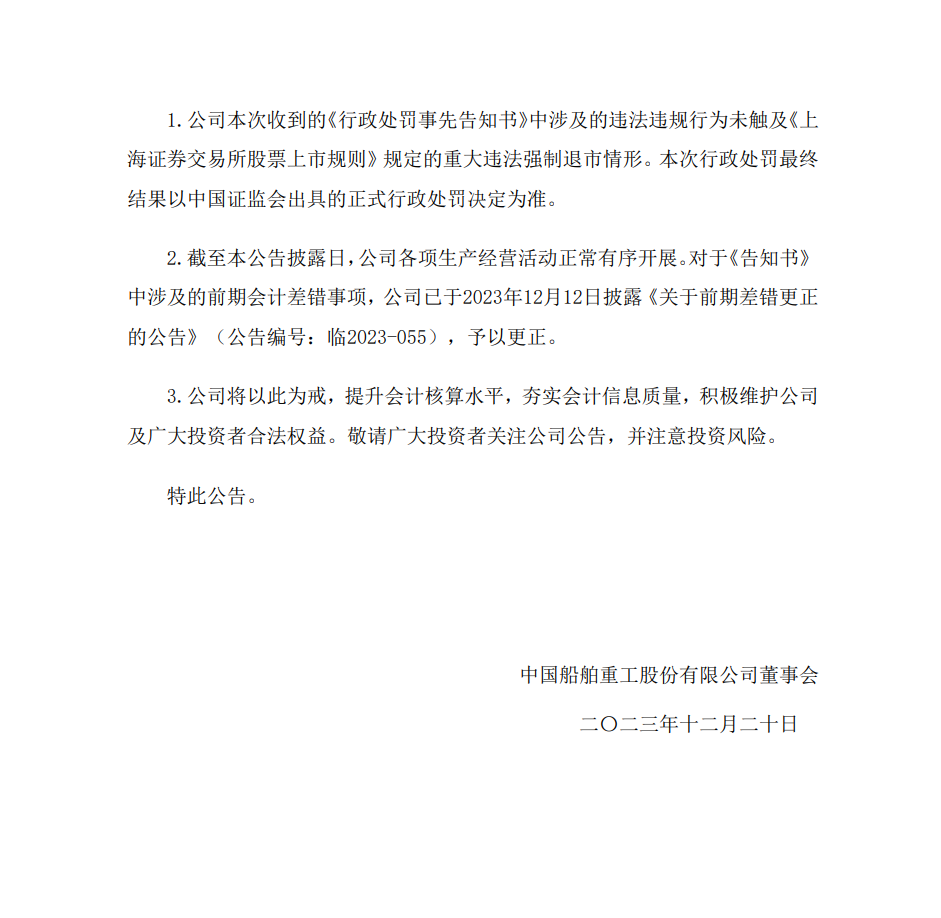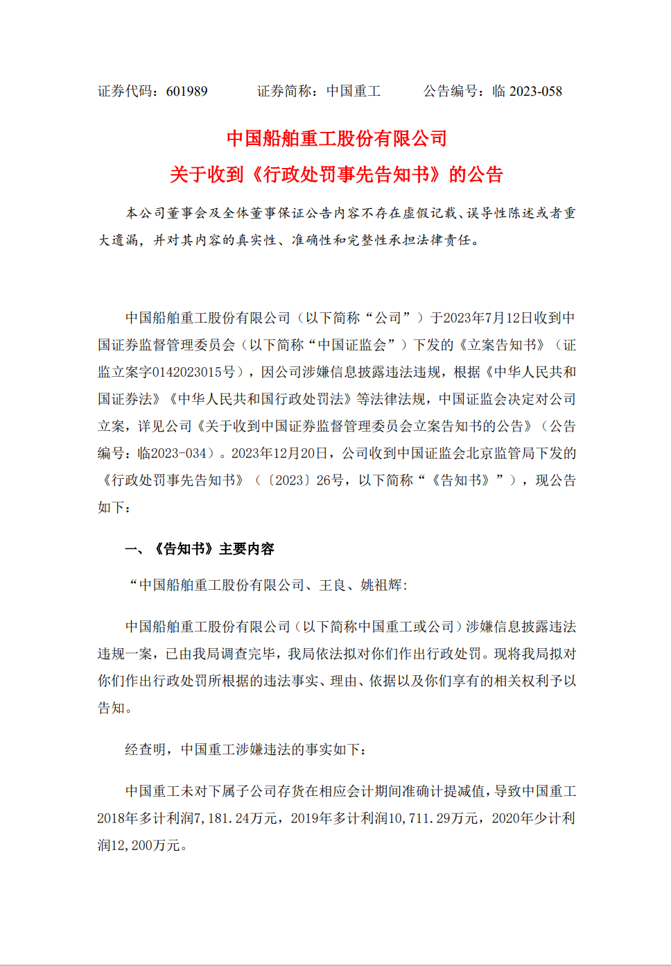 近日,中国重工发布公告称,中国船舶重工股份有限公司于2023年7月12日收到中国证券监督管理委员会(简称:中国证监会)下发的《立案告知书》,因公司涉嫌信息披露违法违规,根据《中华人民共和国证券法》《中华人民共和国行政处罚法》等法律法规,中国证监会决定对公司立案。