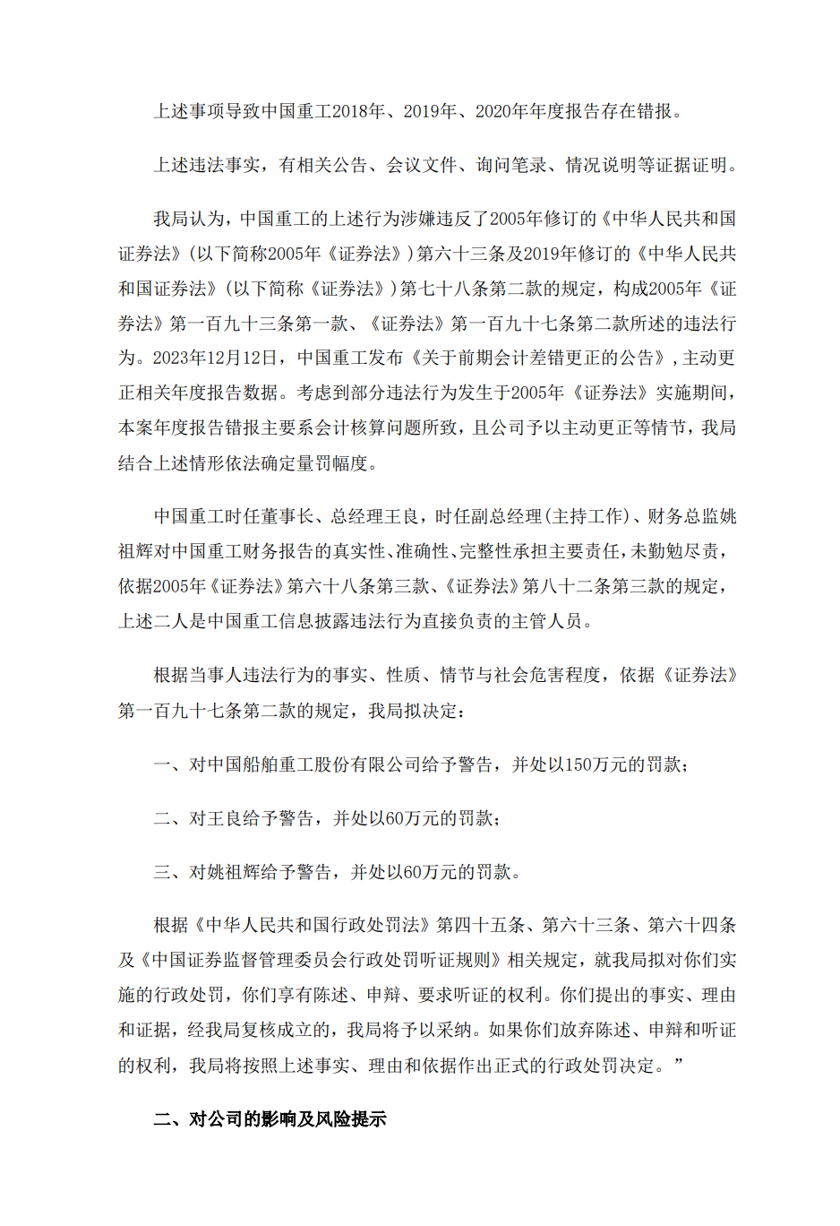 《告知书》主要内容包括,根据当事人违法行为的事实、性质、情节与社会危害程度,依据《证券法》第一百九十七条第二款的规定,中国证监会北京监管局拟决定对中国船舶重工股份有限公司给予警告,并处以150万元的罚款。