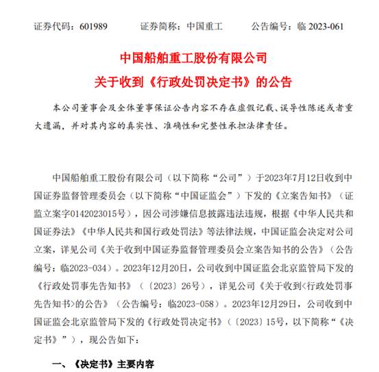 近日,中国重工发布收到《行政处罚决定书》的公告。公告显示,因未对下属子公司存货在相应会计期间准确计提减值,中国重工2018年、2019年、2020年年度报告存在错报。