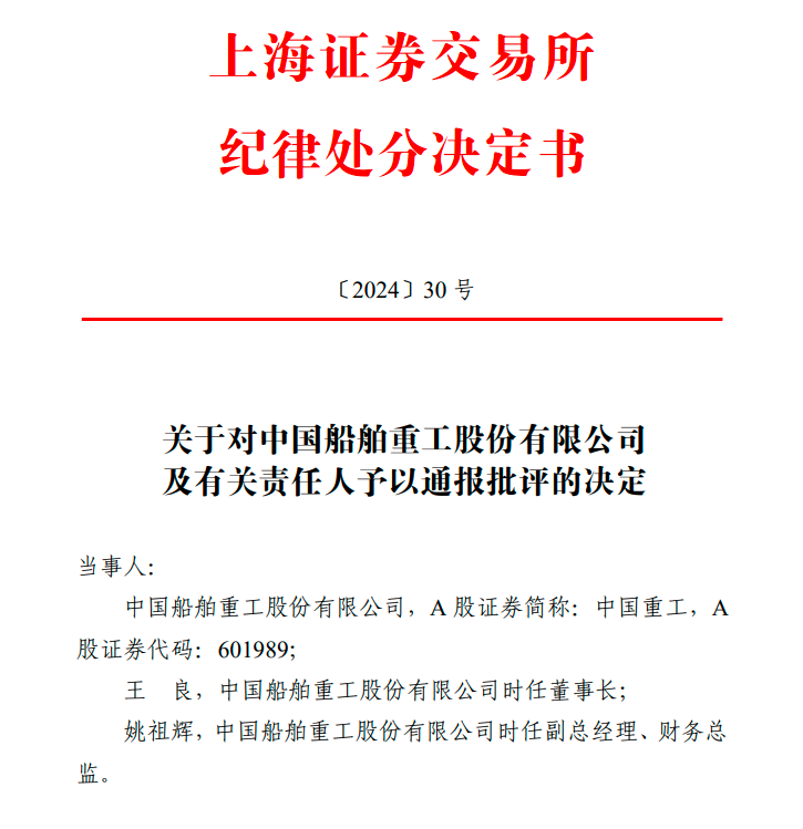 上交所纪律处分委员会根据《股票上市规则》第13.2.3条和《上交所纪律处分和监管措施实施办法》等有关规定,对中国重工及时任董事长王良,时任副总经理、财务总监姚祖辉予以通报批评,并将此事通报中国证监会,并记入上市公司诚信档案。