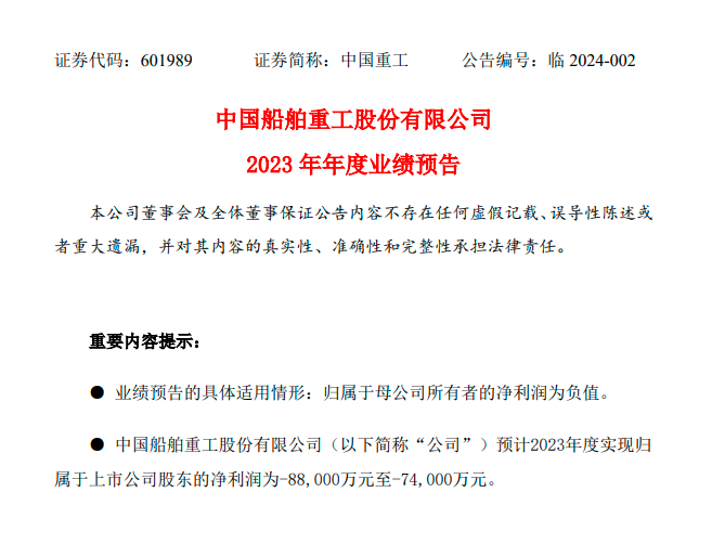 1月30日,中国重工公告,预计2023年度实现归属于上市公司股东的净利润为亏损7.4亿元-8.8亿元。追溯调整前,2022年归属于上市公司股东的净利润为亏损22.12亿元。