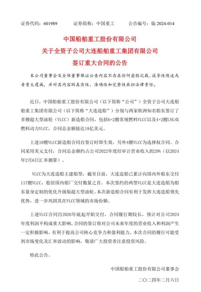 2月6日,中国重工发布公告,称全资子公司大连船舶重工集团有限公司分别与两家欧洲知名船东签订了多艘超大型油轮造船合同,合同总金额接近18亿美元。