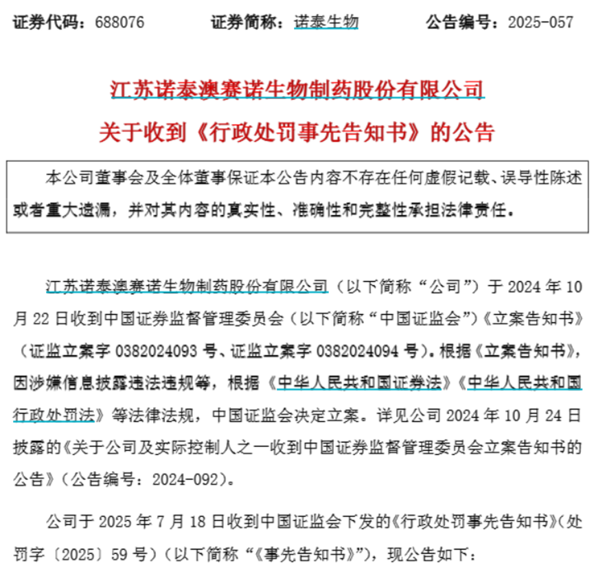 诺泰生物(688076.SH)于2025年7月18日发布公告称,其已收到证监会发布的《行政处罚事先告知书》。公司2021年通过虚构技术转让交易虚增收入3000万元,虚增利润2595万元(占当前利润的20.64%)。造假数据还“污染”了2023年可转债(诺泰转债)发行文件,导致该次募资4.34亿元存在合规瑕疵。