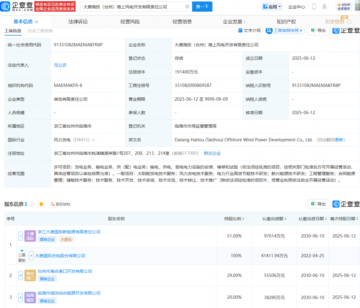 近日,大唐海投(台州)海上风电开发有限责任公司成立,法定代表人为范立农,注册资本为19.14亿元,经营范围包含:发电业务、输电业务、供(配)电业务;太阳能发电技术服务;风力发电技术服务;电力行业高效节能技术研发等。股权穿透显示,该公司由大唐发电旗下浙江大唐国际新能源有限责任公司等共同持股。