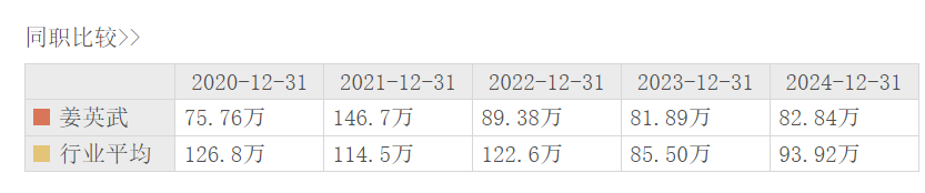 东方财富数据显示,2021年至2024年,姜英武薪酬分别为146.7万元、89.38万元、81.89万元及82.84万元,2024年薪酬微涨。