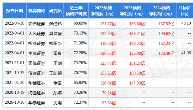 证券之星数据中心根据近三年发布的研报数据计算,国信证券王剑研究员团队对该股研究较为深入,近三年预测准确度均值为73.7%,其预测2022年度归属净利润为盈利123.47亿,根据现价换算的预测PE为14.45。