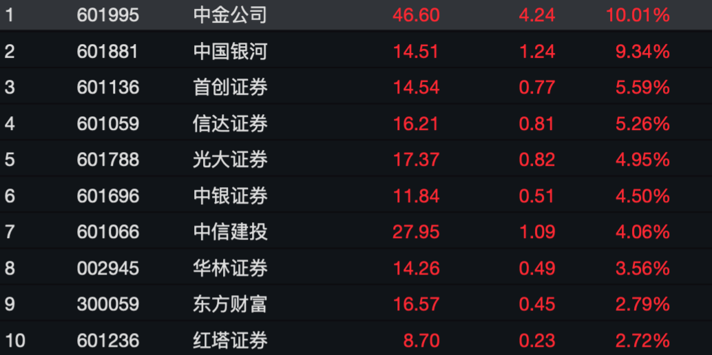 5月9日一早,中金公司就早早涨停,当日成交额高达36.34亿元。中国银河盘中也一度涨停,最终收盘大涨9.34%,股价持续创出年内新高。此外,首创证券、信达证券等日内涨幅都超过5%。