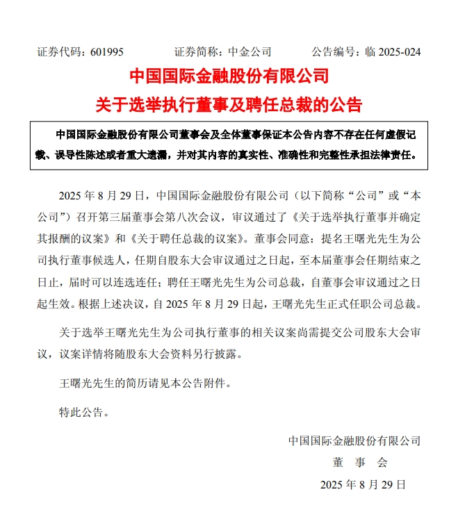 8月29日晚间,中金公司公告表示,聘任王曙光为公司总裁,董事长陈亮不再代行职责。值得注意的是,这也是在时隔14个月后,中金公司重新迎来总裁。