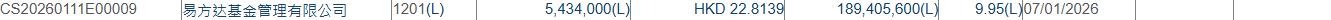 减持后,易方达基金管理有限公司最新持股数目为189,405,600股,持股比例由10.23%下降至9.95%。