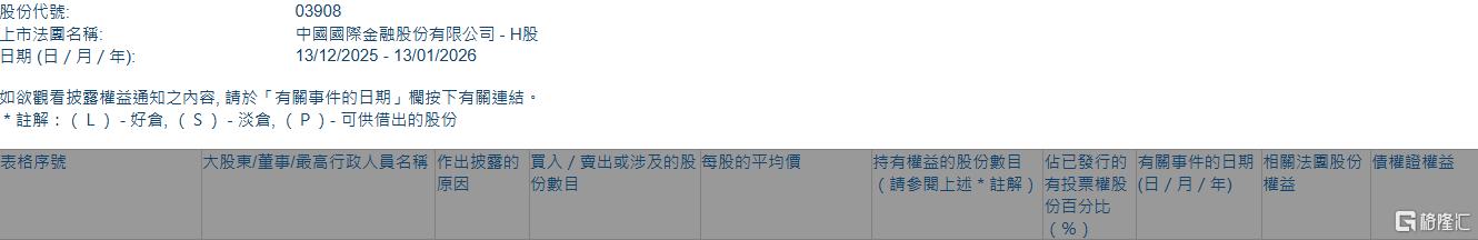 格隆汇1月13日丨根据联交所最新权益披露资料显示,2026年1月7日,中金公司(03908.HK)遭易方达基金管理有限公司在场内以每股均价22.8139港元减持543.4万股,涉资约1.24亿港元。