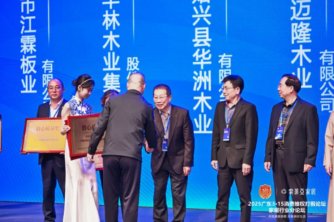 3月15日由索菲亚主办的广东3?15消费维权打假论坛家居行业分论坛在广州白云国际会议中心隆重举行,丰林集团凭借卓越的产品质量与创新能力,一举斩获两项“放心质量奖”,并获评“战略合作供应商”。作为中国定制家居行业首家上市公司,索菲亚联合中国林科院、林产工业协会、知名高校、头部企业等18家权威机构发布《中国定制家5A标准》,丰林集团总裁王高峰受邀参与启动仪式,与索菲亚及其标杆供应商共同承诺以更高标准推动行业高质量发展,为消费者提供安全可靠的家居解决方案。