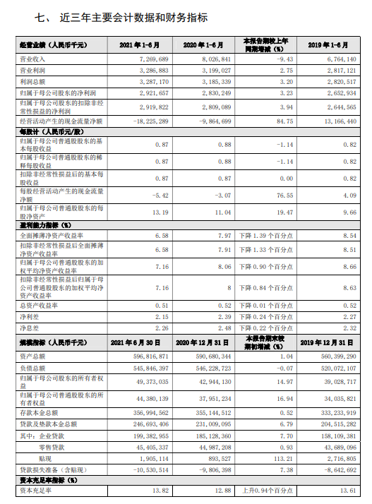 报告期内,公司经营业绩保持稳健。报告期内实现营业收入72.70亿元,同比下降9.43%,一是由于该行积极落实减费让利的有关政策,让利实体经济,且部分存量贷款重定价后执行利率有所下降,加上存款定期化趋势,导致净息差有所收窄。二是受债券市场利率波动影响,导致投资收益同比减少。