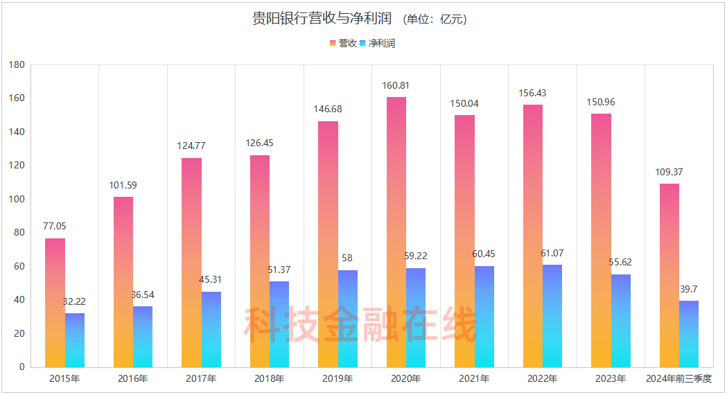 2023年,贵阳银行营收150.96亿、归母净利润55.62亿,同比分别下降3.5%、8.92%。