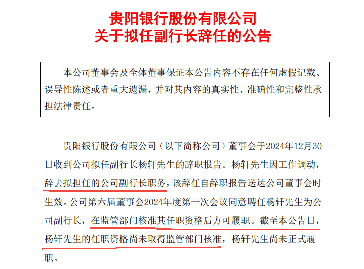 日前,贵阳银行公告称,董事会2024年12月30日收到拟任副行长杨轩的辞职报告。杨轩因工作调动,辞去拟担任的副行长职务,该辞任自辞职报告送达董事会时生效。