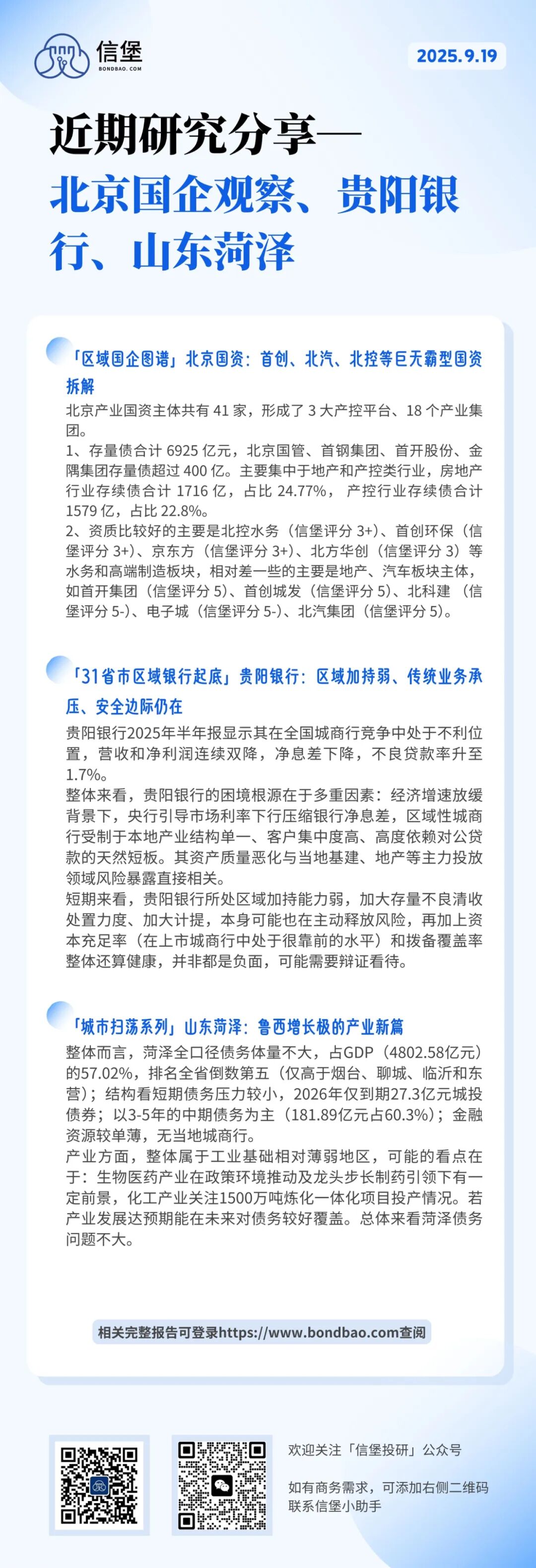 2、资质比较好的主要是北控水务(信堡评分3+)、首创环保(信堡评分3+)、京东方(信堡评分3+)、北方华创(信堡评分3)等水务和高端制造板块,相对差一些的主要是地产、汽车板块主体,如首开集团(信堡评分5)、首创城发(信堡评分5)、北科建(信堡评分5-)、电子城(信堡评分5-)、北汽集团(信堡评分5)。
