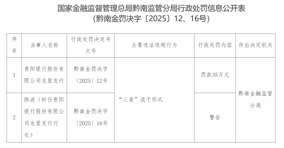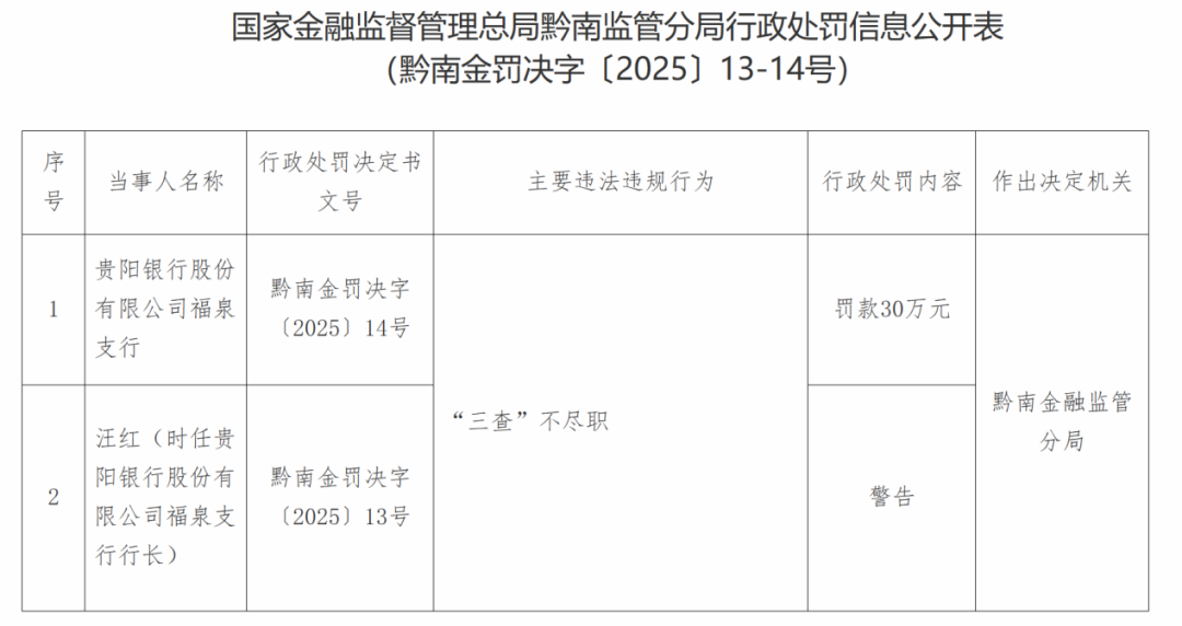 9月30日,据国家金融监督管理总局官网消息显示,贵阳银行两家支行均因“三查”流于形式领到罚单,合计被罚款65万元。其中,龙里支行被罚款35万元,福泉支行被罚款30万元。