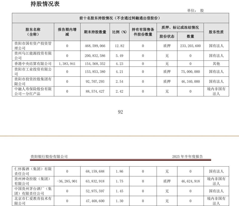 贵阳银行2025年中报披露,贵州神奇控股集团减持3628.5901万股,按贵阳银行二季度股价均价6.01元/股计算,套现2.18亿元。