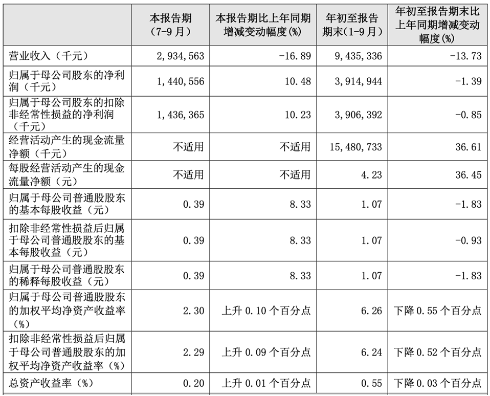 数据显示,今年前三季度,贵阳银行实现营业收入94.35亿元,同比下降13.73%;归属于母公司股东的净利润39.15亿元,同比微降1.39%,整体业绩仍承压。但第三季度单季营业收入为29.35亿元,同比减少16.89%,归母净利润却逆势增长10.48%至14.41亿元,收入下滑与利润增长并存,反映出收入结构失衡与非经营性因素的对冲作用。