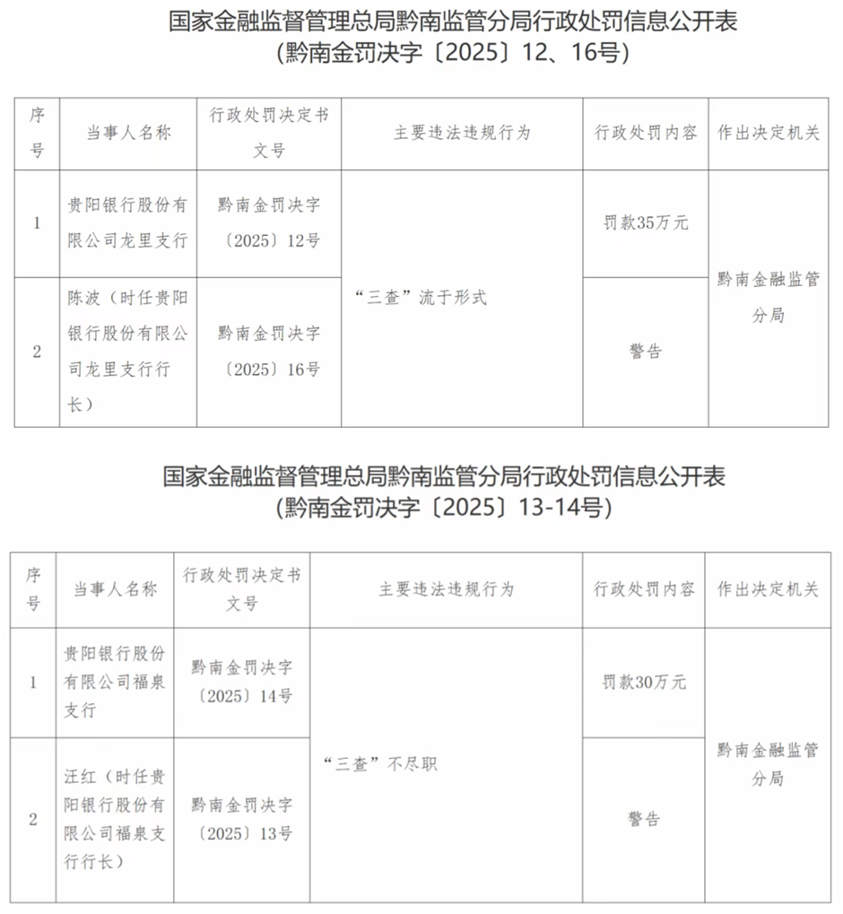 更深层的问题在于,贵阳银行的风控体系与合规管理执行力,已被监管频繁处罚。例如,2025年9月30日,国家金融监督管理总局官网披露,贵阳银行两家支行同日被罚:龙里支行因“三查”流于形式被罚款35万元,福泉支行因“三查”不到位被罚款30万元,时任支行行长陈波、汪红分别受到警告处罚。“三查”制度(贷前调查、贷时审查、贷后检查)是银行信贷风险防控的核心环节,两家支行在同一天被监管点名,反映出该行基层机构在风控执行上存在系统性薄弱环节。