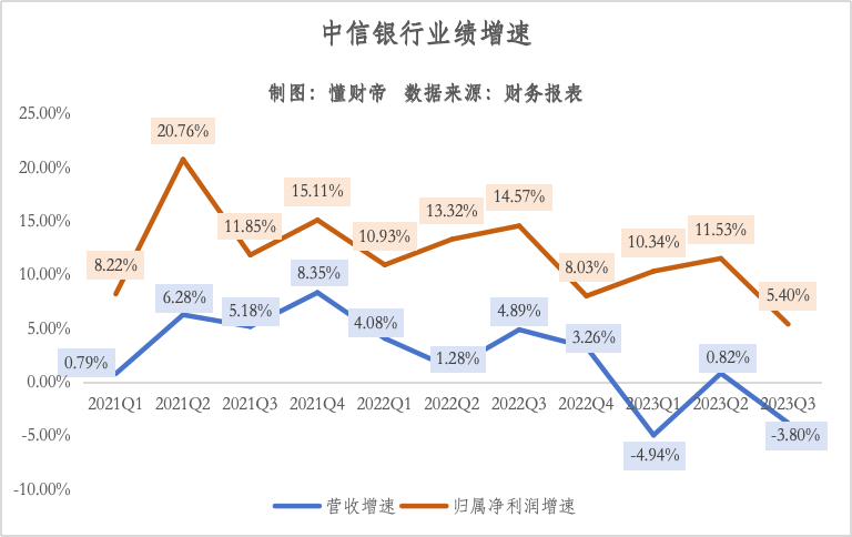 2023年,银行压力进一步加重。中信银行营业收入在Q1、Q3都出现了负增长,前三季度,其营收同比下滑了2.62%,归属净利润增长9.19%,增速亦不及去年同期。