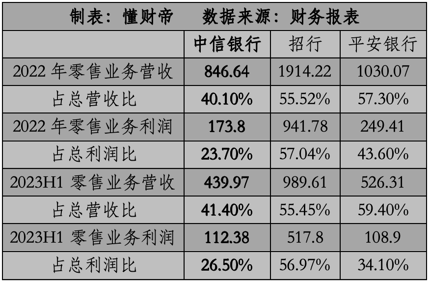 基于财报,2022年、2023H1,中信银行零售转型确实有所成效,零售业务利润占总利润比重提升了2.8个百分点,为26.5%。零售业务占总营收比提升了1.3个百分点,达到41.4%,但还未达到占比50%的战略目标。