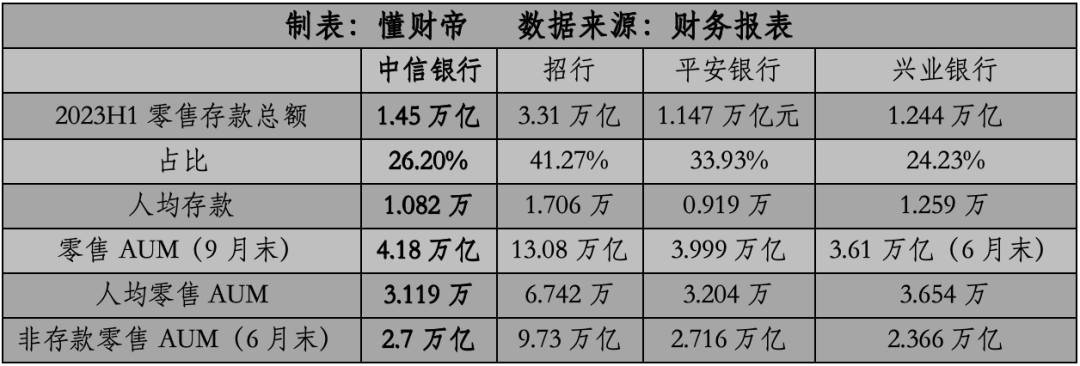 2023H1,中信银行零售存款总额为1.45万亿,规模高于平安和兴业,但其占比仅为26.2%。