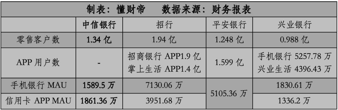 但其零售客户的数字化转型明显迟缓。中信银行尚未披露APP注册用户规模,其手机银行MAU为1589.5万,动卡空间APP MAU为1861.36万,合计为3450.86万,略高于兴业银行,但大幅落后于平安银行,与招行(两大APP合计MAU 1.11亿)更是不在一个数量级。
