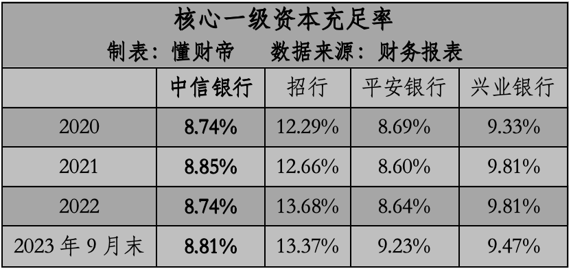 中信银行在我国系统性重要银行中位于第二组,其核心一级资本充足率至少要达到8%。截至2023年9月末,中信银行核心一级资本充足率为8.81%,虽然高于监管要求,但低于招行、兴业、平安等同业。