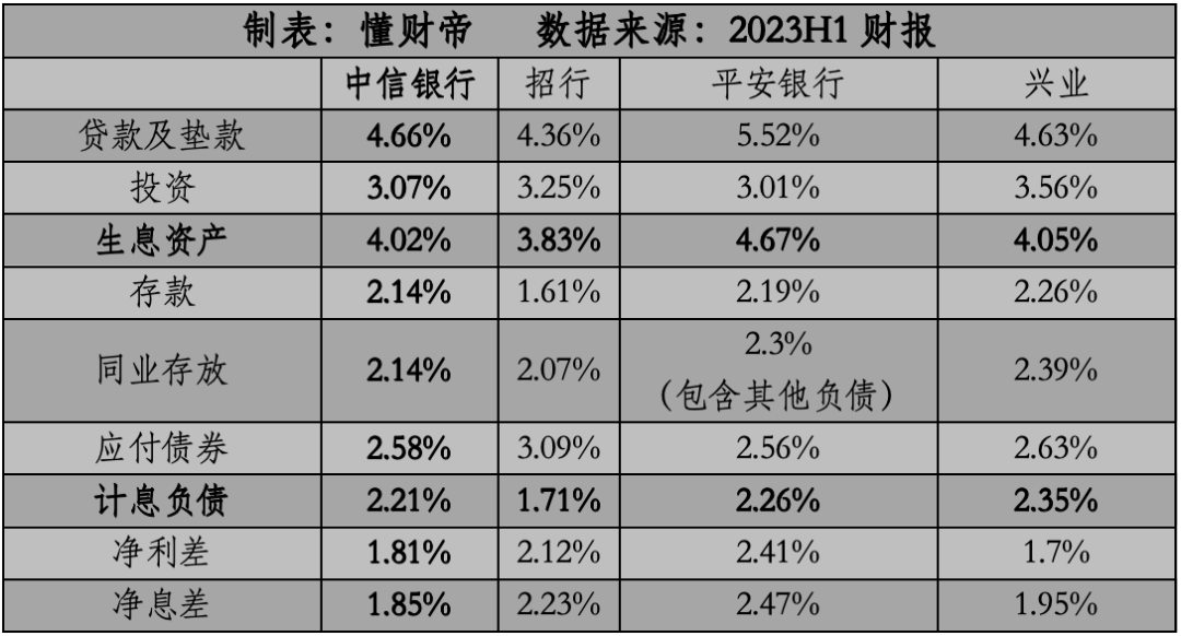 再深度拆解资产负债表,生息资产中最大规模的贷款及垫款,中信银行收益率为4.66%,高于招行30个BP,高于兴业3个BP,并不算低。