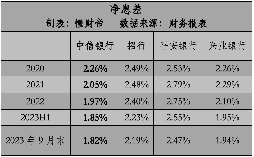 财报数据显示,中信银行的净息差在股份行中处于中游水平。2020-2022年、2023年9月末,分别为2.26%、2.05%、1.97%、1.82%,累计下降了44个BP,降幅明显超过招行、平安、兴业。