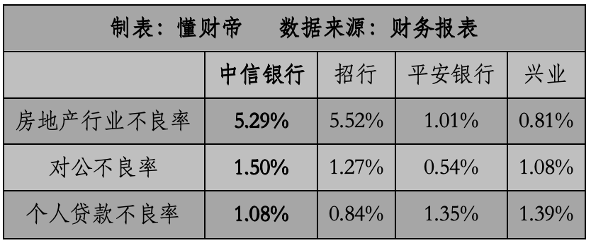 同时期,中信银行的对公贷款不良率显著高于招行、平安、兴业,其个人贷款不良率较去年末亦上升了0.05个百分点,至1.08%。