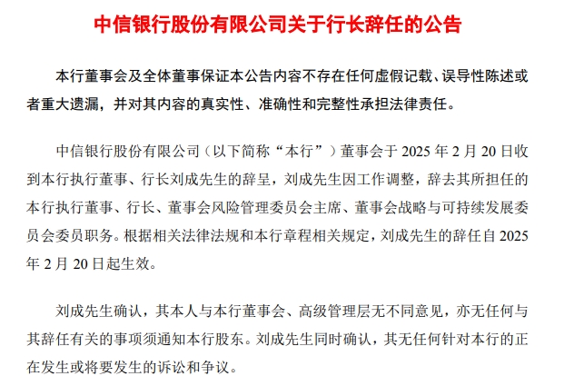 就在同一日,因工作调整,刘成递交辞呈,辞去其所担任的中信银行行长等职务,辞任自2025年2月20日起生效。