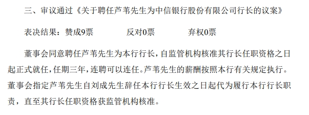 相关公告显示,董事会同意聘任芦苇为该行行长,自监管机构核准其行长任职资格之日起正式就任,任期三年,连聘可以连任。芦苇的薪酬按照本行有关规定执行。