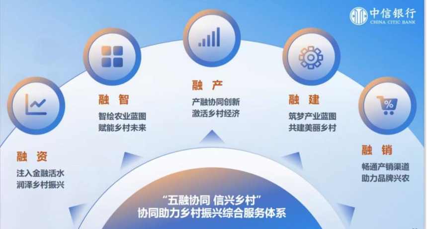 论坛上,中信银行正式发布涵盖“融资、融智、融产、融建、融销”五大领域的“五融”协同助力乡村振兴综合服务体系。该服务体系依托中信集团“金融全牌照、实业广覆盖”的优势,通过业务协同整合各方资源,满足涉农企业、园区和农户等经营主体的规划设计、建设施工、投融资、购产销一体化、数字化运营、收购兼并、跨境出海等各类需求。其中,“融资”通过股、债、贷、投等综合服务为乡村振兴注入金融活水;“融智”发挥集团成员企业智库资源优势,开展农业领域咨询服务;“融产”提供良种研发推广、数字化耕种和土壤改良等特色化支持;“融建”聚焦产业园、高标准农田等建设场景,共筑产业蓝图、共建美丽乡村;“融销”畅通农产品产销渠道,助力品牌兴农。中信银行表示,将把自身综合金融服务优势嵌入“五融”协同服务全链条,立体化赋能乡村振兴,助力农业产业升级。