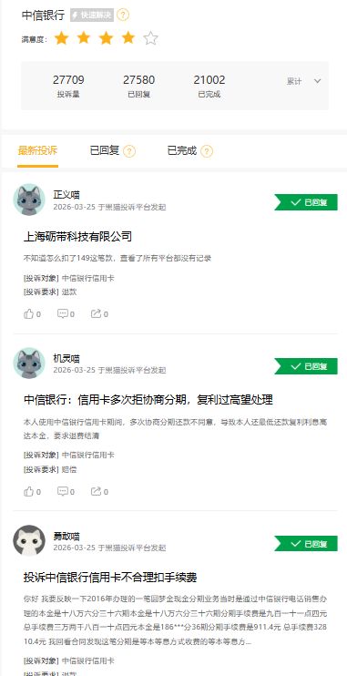 其中,信用卡业务相关的投诉占了53.92%,也就是说将近14万件。在黑猫投诉平台上,关于中信银行的投诉累计超过2.7万条,大部分都和信用卡有关。