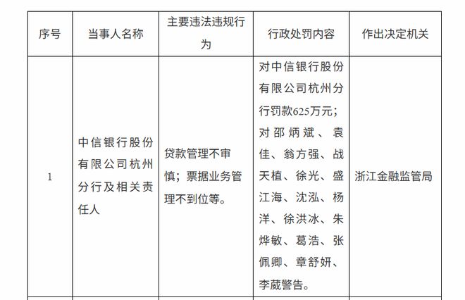 例如2026年2月,国家金融监督管理总局浙江监管局公布了一张中信银行的罚单。因贷款管理不审慎、票据业务管理不到位等主要违法违规行为,浙江金融监管局对中信银行股份有限公司杭州分行罚款625万元。同时,多人因贷款管理不审慎、票据业务管理不到位等被警告。